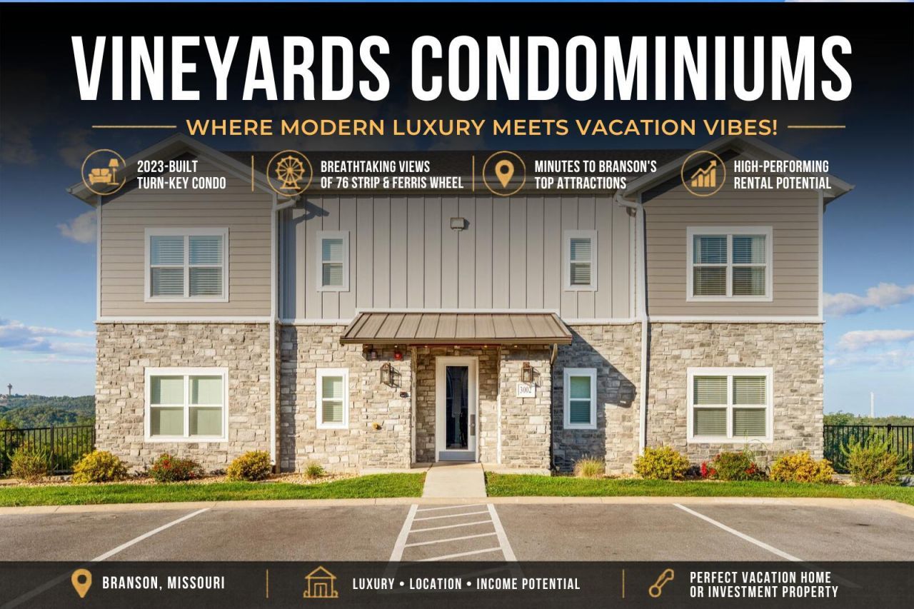 Vineyards Condominiums - Where Modern Luxury Meets Vacation Vibes!Welcome to this stunning 2023-built condo, nestled in the heart of Branson! Whether you're looking for a high-performing income-producing vacation rental, a dreamy vacation home, or your everyday escape, this turn-key gem checks every box.Step inside to upscale, modern finishings and stylish décor ? completely furnished and ready for its next savvy investor or adventure-loving owner. Enjoy breathtaking views of the glittering lights along the iconic 76 Strip and Ferris Wheel right from your window!Perfectly located just minutes from Silver Dollar City, entertainment, shopping, dining, and all of Branson's top attractions, this condo is as cute as a button and as smart as a portfolio upgrade.Don't miss your chance to own a slice of Branson paradise!