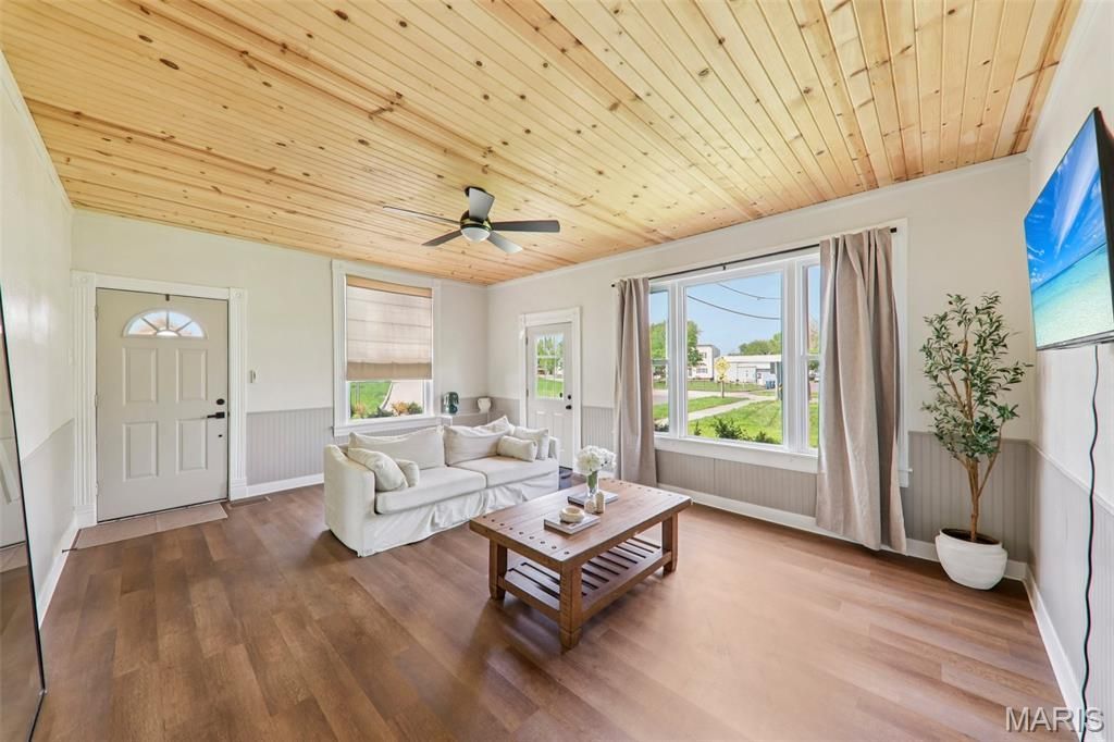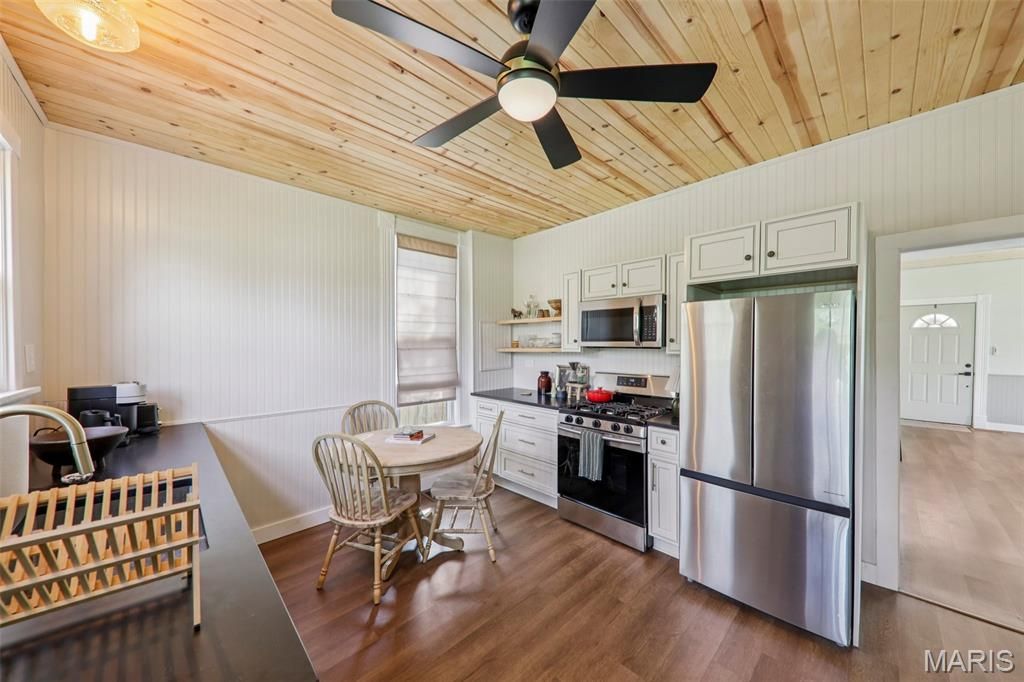 Step onto the porch of this charming 150-year-old home and feel Edwardsville's soul welcome you in. Inside, rich pine plank ceilings stretch overhead, beadboard wainscoting wraps the walls, and original doors, trim, and brass fixtures carry vintage character into every corner, while refreshed white cabinets, quartz counters, a stainless gas range, new flooring, and a sliding barn door blend modern ease with historic charm. At 2 bedrooms, 1 bath, and 860 square feet, this home lives bigger than its footprint. But the real magic is the setting: the MCT bike trail runs right alongside the property, and historic Leclaire, downtown Edwardsville's shops, coffee, and restaurants are all a short stroll away. A 2024 roof adds peace of mind from day one. Character AND move-in ready. History AND walkability. Homes like this are the heartbeat of Edwardsville, and they don't wait around. Schedule your private showing today.